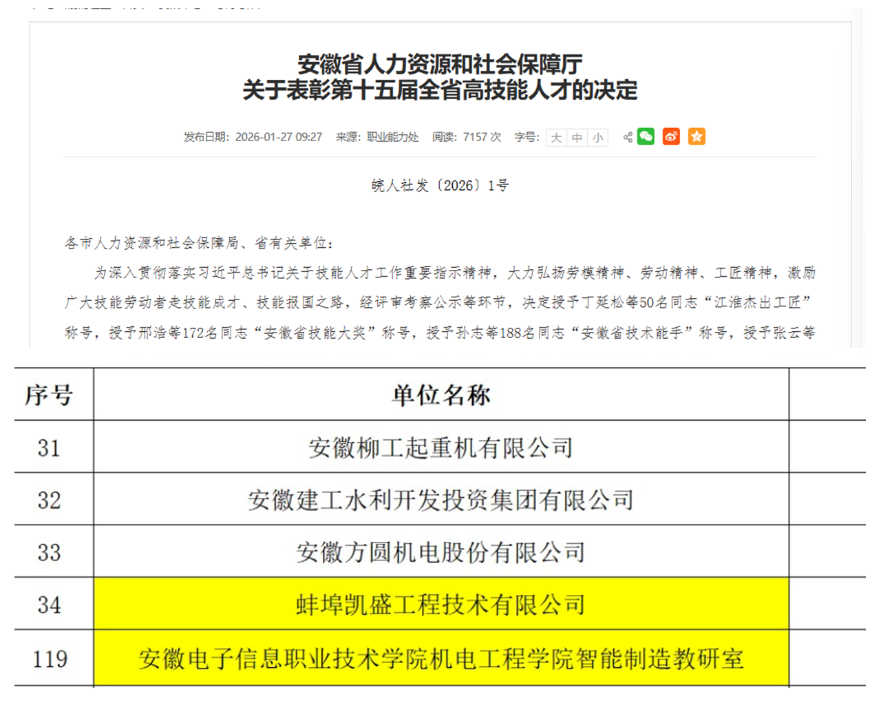 本网讯       近日,安徽省人力资源和社会保障厅公布了第十五届安徽省高技能人才表彰名单,香蕉视频APP官网机电工程国产香蕉视频免费智能制造教研室与智能制造产业国产香蕉视频免费龙头企业蚌埠凯盛工程技术有限公司双双荣获 “安徽省技能人才培育工作先进单位”称号,这一荣誉的获得,是对双方长期深耕产教融合,协同培养高技能人才的高度肯定,也是校企双方在服务地方产业发展中取得的重要阶段性成果 91香蕉在线观看