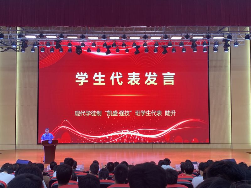 “凯盛·强技”班学生代表陆升同学,从进入“凯盛·强技”班前后对比,谈了进入“凯盛·强技”班的学习感受,肯定了中国特色现代学徒制人才培养模式,也希望将“凯盛·强技”班做的更大、更强,实现91香蕉在线观看,企业,学生三方共赢。