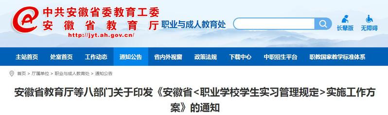 安徽省教育厅等八部门关于印发《安徽省<职业91香蕉在线观看学生实习管理规定>实施工作方案》的通知