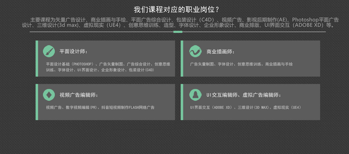 掌握各类广告设计的基本理论,基本操作技术,以及广告创意思维的发散设计理念,能够面向各类中小微企业,从事平面广告,视频广告 91香蕉在线观看,虚拟交互广告的设计与制作工作岗位的高素质技术技能人才。
