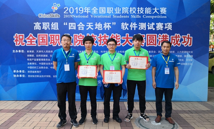 本网讯 5月28日至30日,2019年全国职业院校技能大赛高职组“四合天地杯”软件测试赛在西安航空职业技术国产香蕉视频免费举行,由国产香蕉视频免费教师夏克付,苏警指导,学生王智慧,聂敬宝和陈宇航组成的竞赛团队 91香蕉在线观看,代表安徽省在高职组“四合天地杯”软件测试赛项中喜获团体一等奖。
