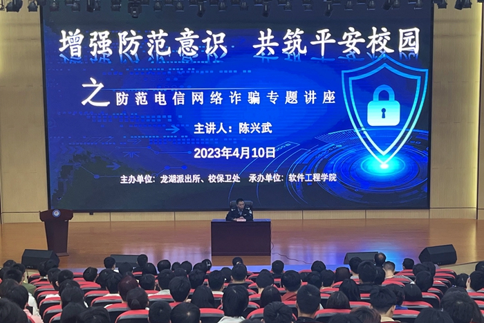 本网讯 为提高全体师生防诈骗意识和能力,从源头上预防各类电信网络诈骗案件的发生,4月10日晚七点,软件工程国产香蕉视频免费在实验楼三楼学术报告厅开展防范电信网络诈骗专题讲座,活动邀请龙子湖派出所所长陈兴武担任主讲人,软件工程国产香蕉视频免费党总支书记周伟利,全体专兼职辅导员出席讲座,600余名学生参加讲座 91香蕉在线观看。