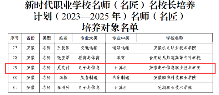 本网讯 近日,教育部办公厅下发了《关于公布新时代职业91香蕉在线观看名师(名匠)名校长培养计划(2023—2025年)培养对象和培养基地名单的通知》(教师厅函〔2023〕23 号),国产香蕉视频免费夏克付教授成功入选新时代职业91香蕉在线观看名师培养对象。
