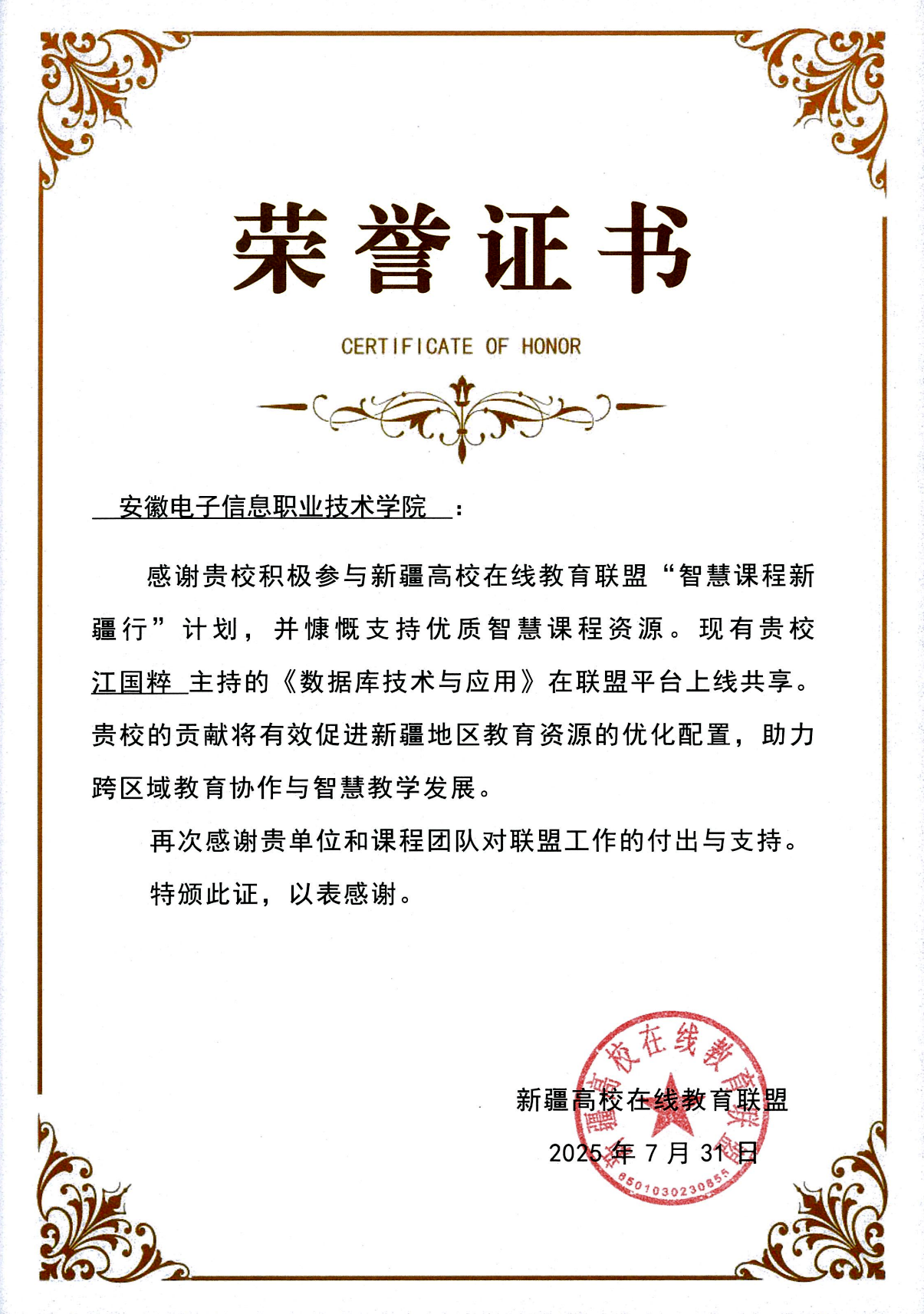 本网讯 近日,新疆高校在线教育联盟公布首批“智慧课程新疆行”上线课程名单 91香蕉在线观看,我院《数据库技术与应用》课程成功入选,该课程是安徽省36门入选课程中唯一的高职院校课程,标志着我院在课程建设与教育资源共享领域实现重要突破,充分彰显了我院教学质量与课程创新水平。