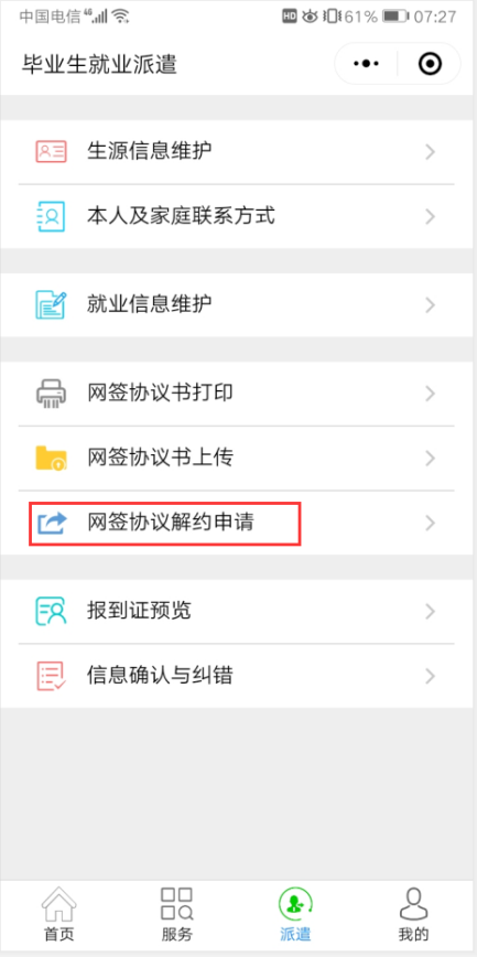 第一步、毕业生进入微信小程序:安徽省大学生就业服务平台,点击“派遣”,进入“解除就业协议申请”,上传解约申请材料。