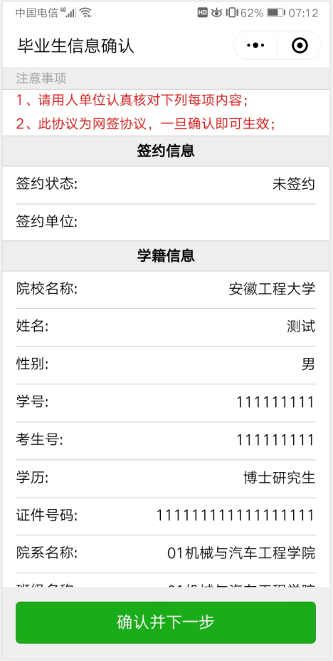 第二步、用人单位打开微信,使用扫一扫功能,扫码后,会出现填写签约信息页面;用人单位首先验证毕业生信息,确认下一步后,填写本单位基本信息、联系方式、劳动合同和违约预定,上传社会统一代码证图片,然后点击“要约确认”后提交。