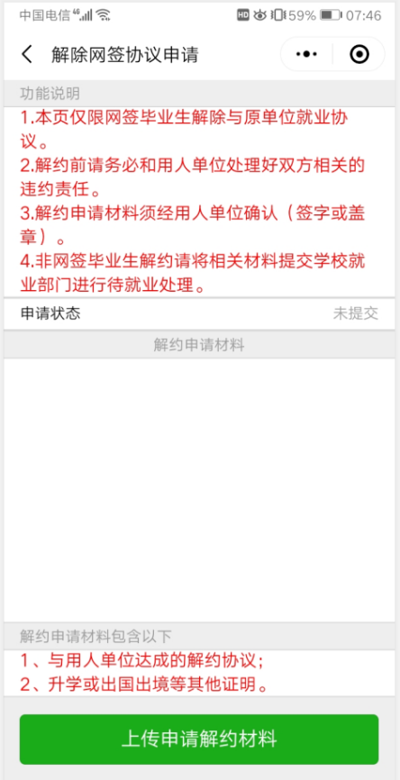 前提:只有网签的毕业生才能在小程序内提交解约材料,其他方式就业并需要解约的,线下联系91香蕉在线观看管理员处理即可。