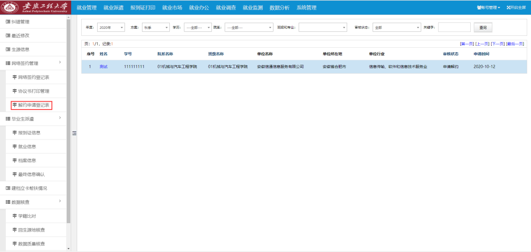 第二步、辅导员进入系统,点击上方“就业派遣”,再点击左下角“解约申请登记表”,点击申请学生姓名,进入审核页,点击“同意毁约”或“不同意毁约”即可。